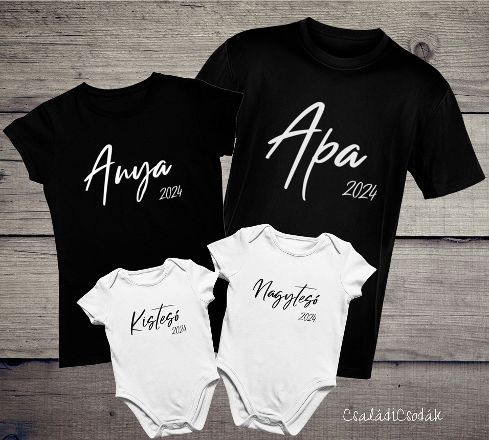 Az ár szettre értendő: 1 db női póló + 1 db férfi póló +2 body/gyerek póló
